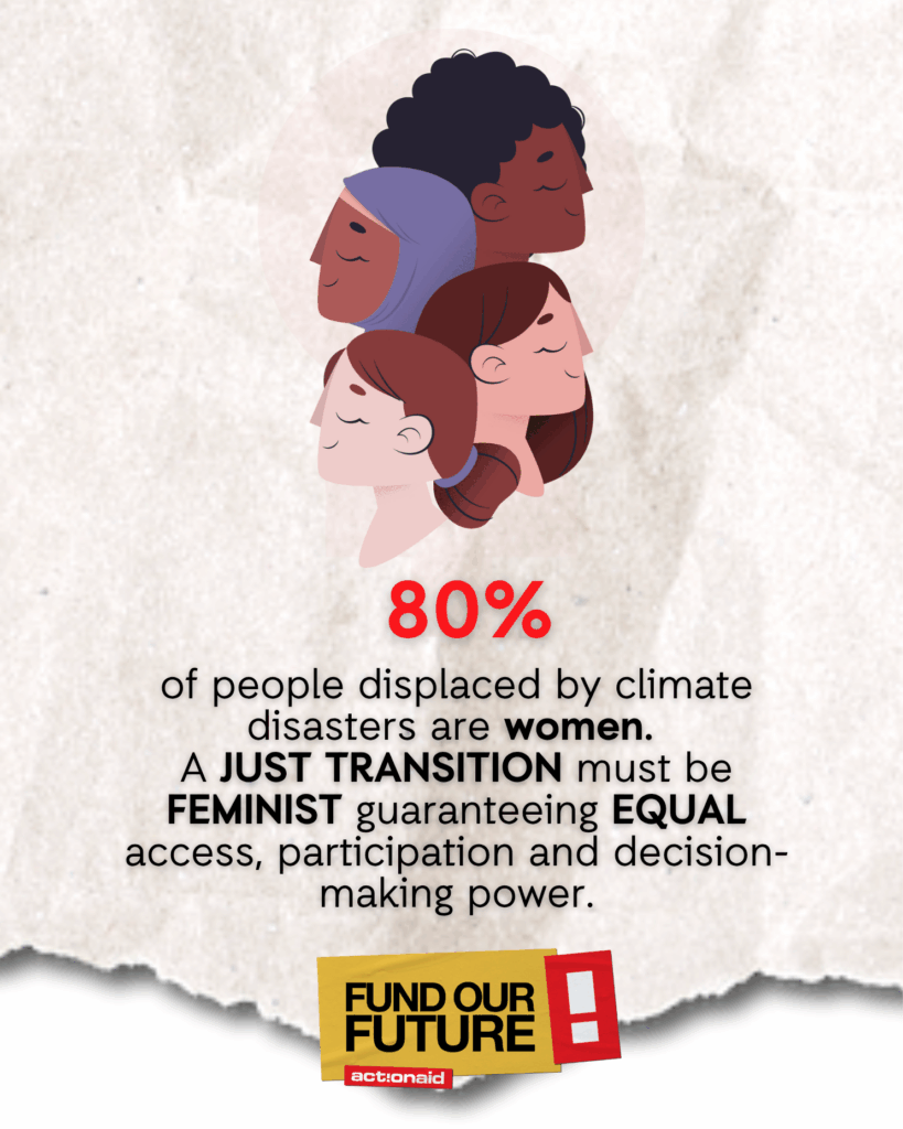I klimat- och naturkatastrofer drabbas kvinnor värst av flyktingskap och obetalt hemarbete men ställs utanför beslutsfattande. En feministisk och rättvis omställning säkerställer jämställt deltagande i beslutsfattandet, samt prioriterar finansiering av omsorgstjänster, insatser mot könsbaserat våld och trygg försörjning.